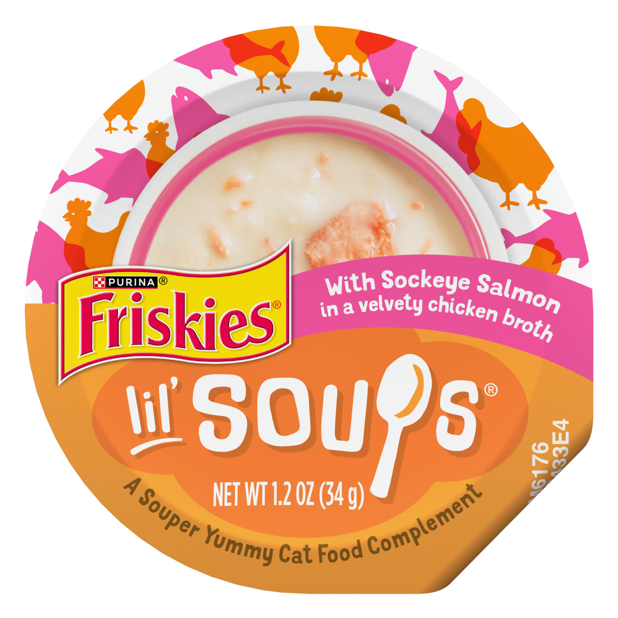 18 Pack Friskies Grain Free Wet Cat Food Complement Variety Pack Lil Soups With Sockeye Salmon Tuna In Broth 1 2 Oz Cups Walmart Com